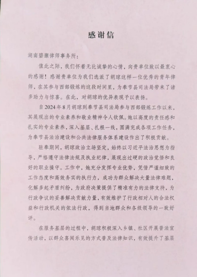8月中旬,律所收到重庆市奉节县司法局发来的感谢信,表彰本所胡琼律师自2024年8月参加司法部西部锻炼计划以来的突出贡献。胡琼律师在奉节县期间,深度参与地方法治建设与公共法律服务体系建设,协助处理多起疑难纠纷,其专业素养与奉献精神获当地政府与群众一致好评。此举展现碧灏律师的社会担当与跨区域法律服务能力。