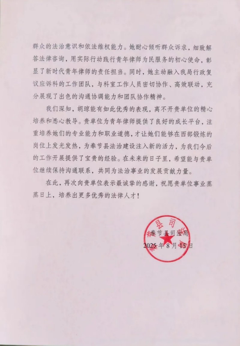 三、西部奉献获赞誉:胡琼律师获奉节县司法局致信感谢