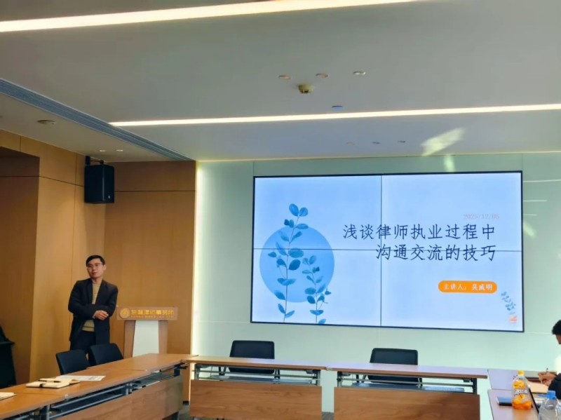 12月5日,本所召开月度例会,聚焦律师核心技能。吴威明律师作了题为“浅谈律师执业过程中沟通交流的技巧”的主题分享。他从客户洽谈、庭审表达、同事协作等多维度,结合生动实例,剖析了有效沟通在提升法律服务质效、构建信任关系中的关键作用,引发了与会律师的深入共鸣与讨论。